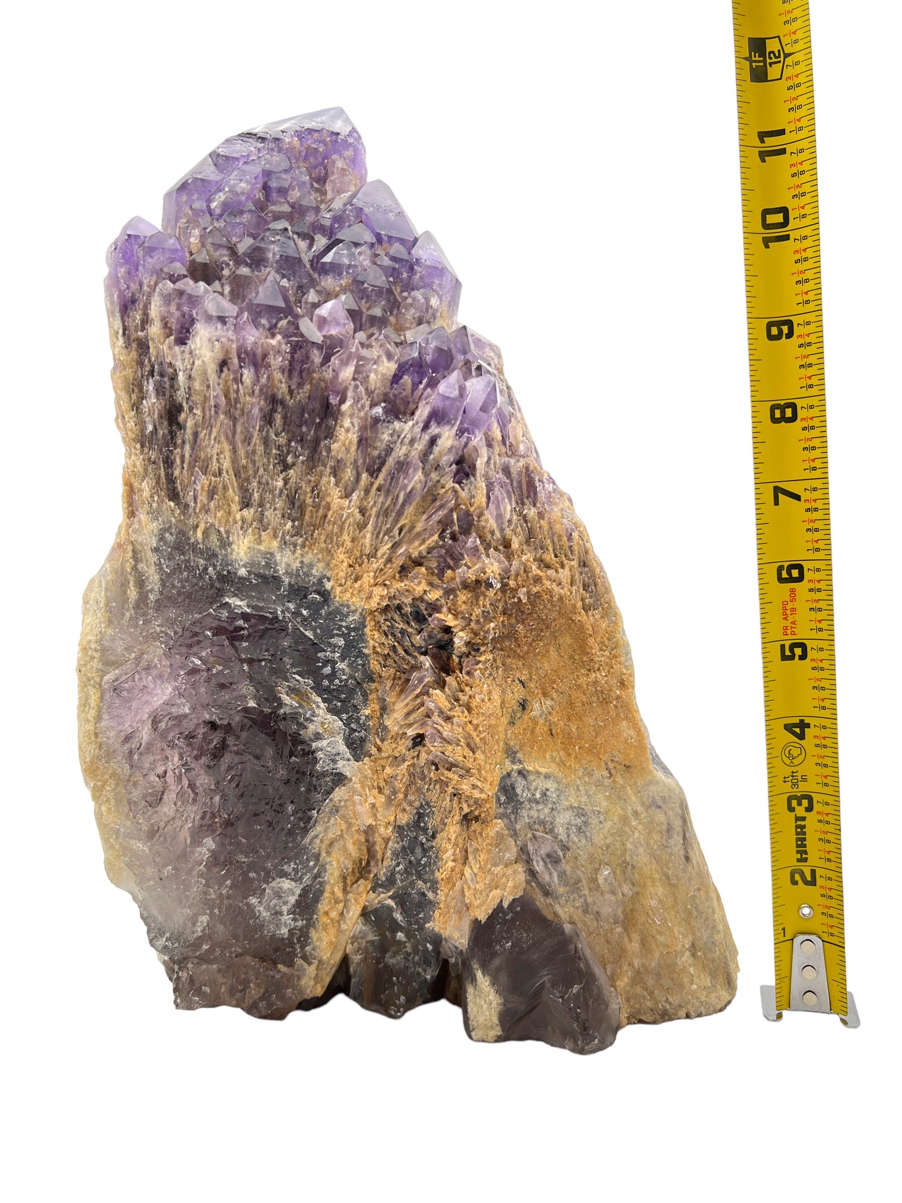 Big chunks of purple amethyst can be particularly interesting because it allows you to see the crystal formations and color variations more clearly. Amethyst crystals can grow in a variety of shapes, including clusters, geodes, and scepters. These formations can range in size from small and delicate to large and impressive. One of the most fascinating features of amethyst is the deep purple coloration that gives this stone its name. The color is caused by trace amounts of iron and other minerals that are present during the crystal's formation. However, the intensity and hue of the purple can vary depending on the location and conditions in which the crystal formed. Another notable feature of amethyst crystals is their transparency. While some specimens may have notable inclusions or cloudiness, the highest quality and most highly prized amethysts have a high degree of clarity and brilliance. In some cases, large chunks of amethyst can be cut and polished into breathtaking sculptures or decorative objects, making them an impressive addition to any collection or space.